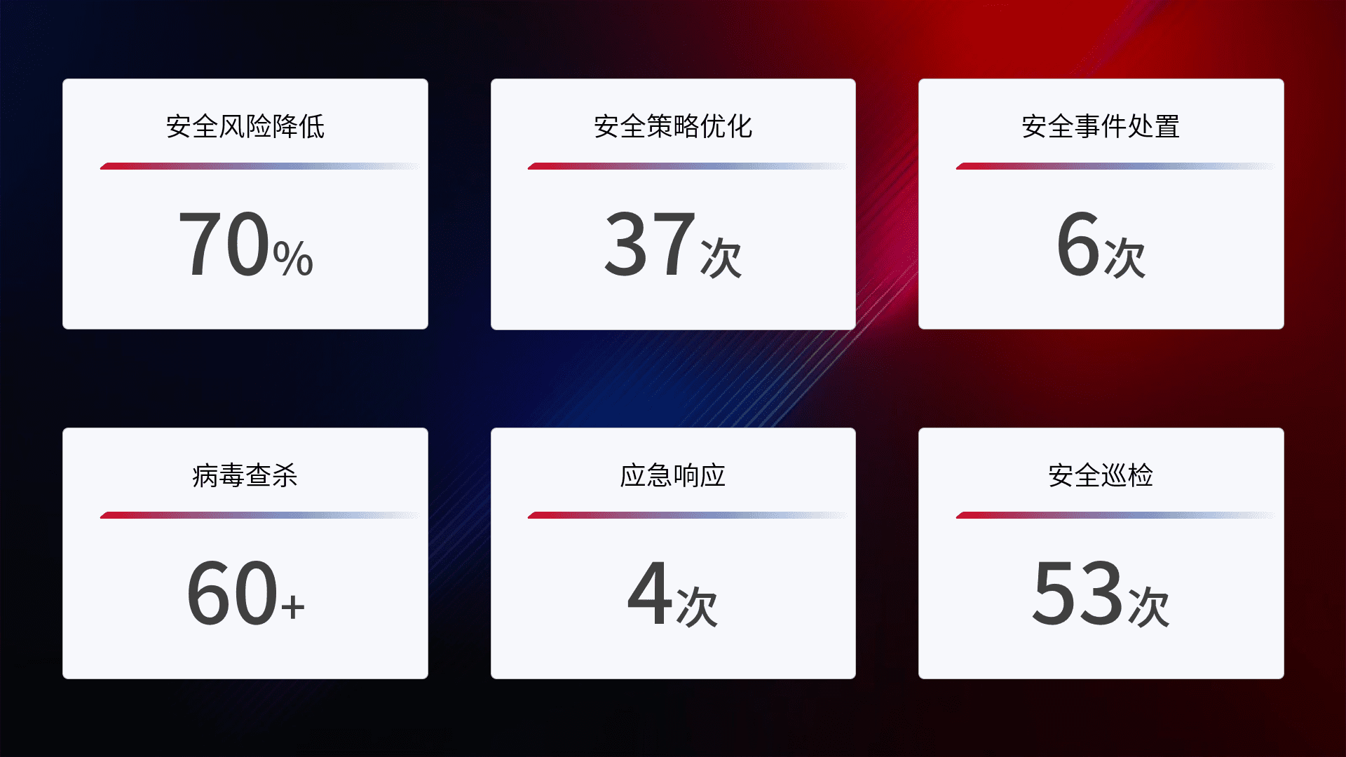 提供全面的安全事件报告体系,,包括处置报告、、、、周报、、、、季度和年度总结,,,结合持续监控,,,帮助客户深入了解网络安全状况。。。