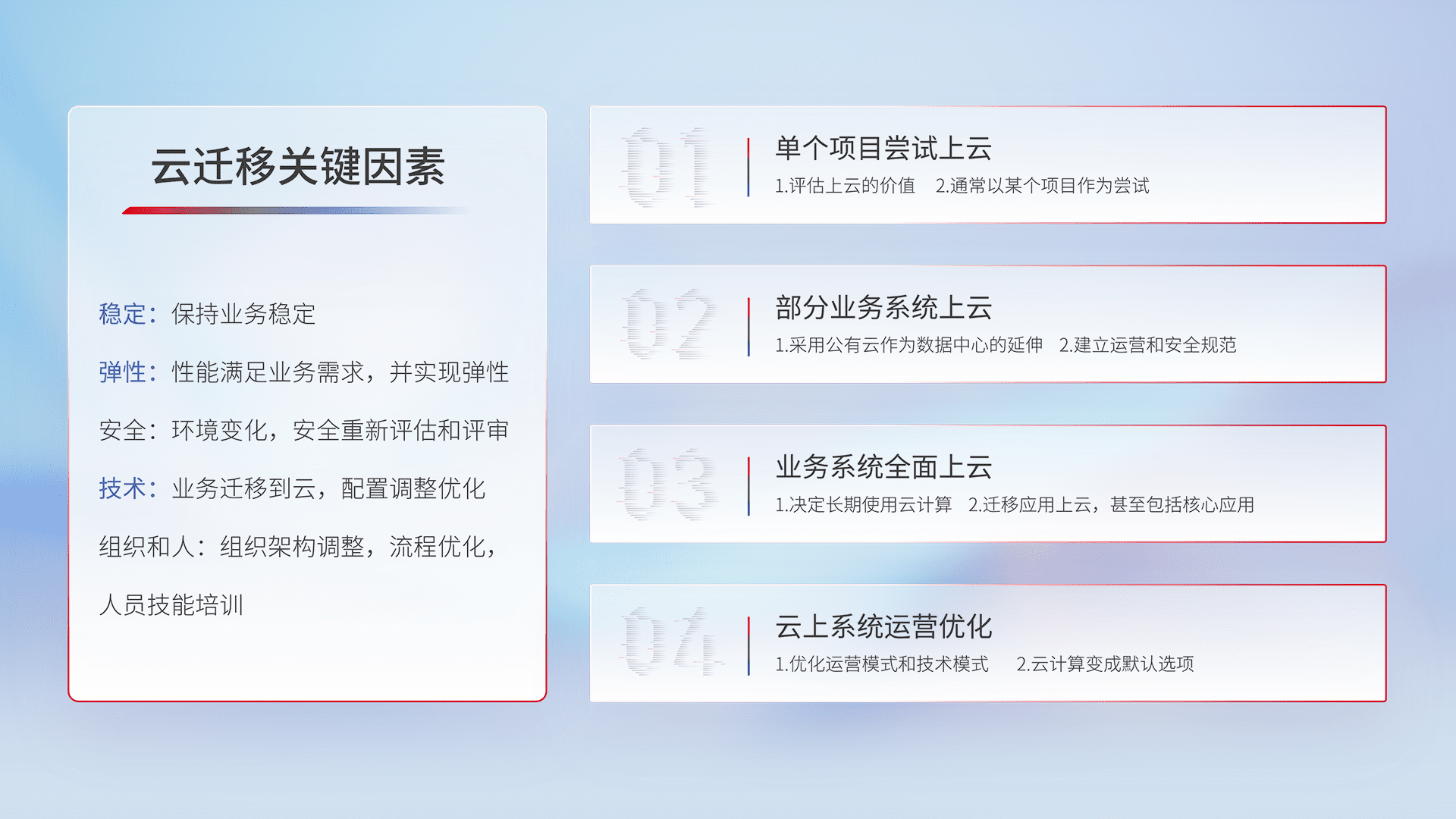 结合实际业务,,,,从规划设计、、云平台选型、、、、云原生改造、、、、数据迁移、、集成交付,,迁移全过程为客户识别最佳上云路径,,,,做好风险识别管理,,,设计网络架构、、、身份权限、、、、安全审计合规、、、操作审计、、、日志审计、、、、监控告警策略、、、多站点容灾设计等,,对云上基础设施进行整体规划,,,提升IT治理水平,,,以满足弹性、、高可用、、、、高性能的需求。。。。