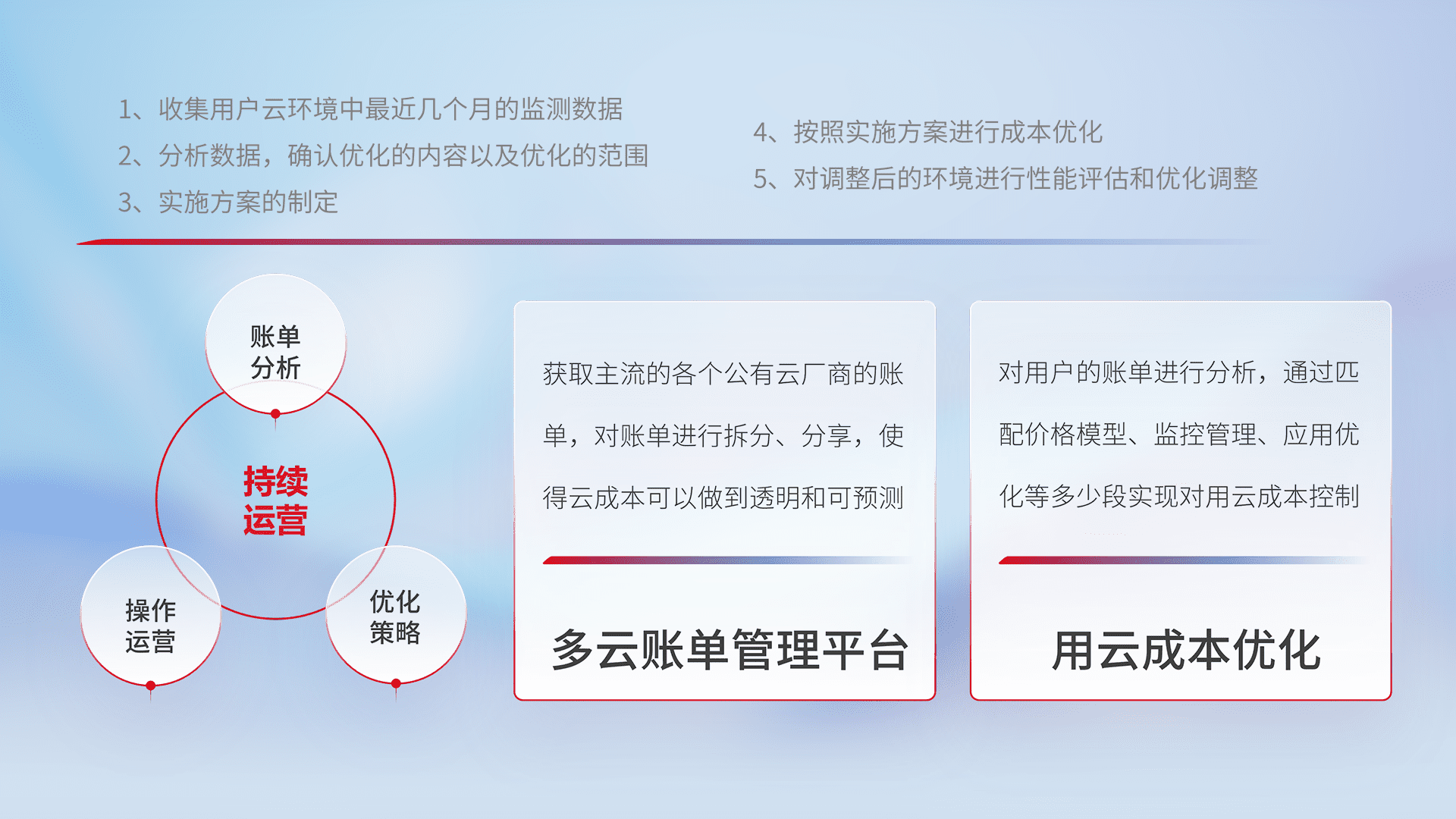 通过多云纳管,,,以统一的资源数据模型把客户的云资源进行抽象和封装,,,进而实现对多云资源的统一操作,,,,保障云资源管理的可靠性、、、稳定性与可用性。。。量身定制化运维内容,,配置、、、、开发运维、、、补丁管理、、备份、、监控、、、、认证和访问管理、、审计和日常巡检等,,保障在用云过程中的可靠度,,,稳定度以及高可用率。。